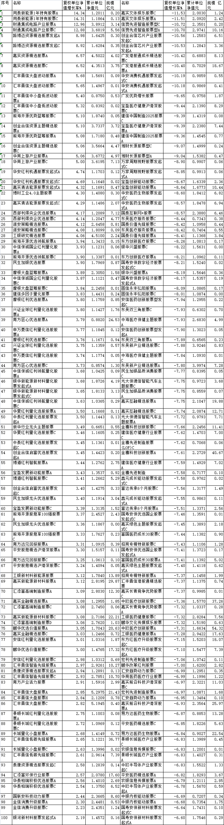 中国经济网北京11月4日电(记者康波)去年10月,1048只(各成分单独计算,下同)业绩可比的普通股票基金中,共有290只实现业绩增长,占比28%。另有3只个股持平,755只个股下跌。从涨幅排名来看,10月份涨幅超过10%的普通股仅有4只,分别是同泰新能源一年期控股股A、同泰新能源一年期控股股C、卡芒集成电路产业股A、财通集成电路产业股C,涨幅分别为14.34%、14.31%、12.96%、12.88%。此前发布的今年三季报显示,昂同泰新能源元年十大重仓股分别为永鼎股份、旭光电子cs、合端智能、精达股份、安泰科技、东方钽业、艾科赛博、安徽科技、太子新材、国光电气。该基金自今年5月起由陈宗超管理。曾任中芯国际高级芯片研发工程师、AMD高级芯片研发工程师、高台聚安研究院分析师、上海盛宇股权投资基金管理有限公司投资经理、上海鼎丰明德资产管理有限公司研究总监、南京龙骏投资有限公司投资总监、富辰杰信(天津)科技信息咨询合伙企业投资总监。 2020年6月加入同泰基金,现任行业研究副总监、投资研究部基金经理。财通集成电路行业股票由10年资深人士金子才管理。三季报显示,基金重仓富联实业、生益T科技、生益电子、中基旭创、深南电路、上海电气股份有限公司、中材科技、鼎泰高科、信亿盛、东材科技。今年资金累计增幅几乎翻倍。此外,10月份涨幅超过5%的普通股基金还有中小盘低波动股C、前海开元优势蓝筹股C、创金合信资源主题精选股A等基金。其中,路博迈资源精选股、收获资源精选、创金合信资源主题精选均重点关注制造业股。例如,路博迈资源在三季报中精选了紫金矿业、赣锋锂业、招金矿业、天齐锂业、赤峰黄金、洛阳钼业等重仓股。嘉实资源的资源主要集中在紫金矿业、洛钼、西部矿业、中国铝业、天山铝业、陕煤集团、中深矿业等。ua 和中国矿产资源。创金合信资源主题精选还持有工业银锡、紫金矿业、洛阳钼业、华友钴业、天山铝业、山东黄金、中国神华、云铝股份、中金黄金、赤峰黄金。而汇丰晋信大盘波动股,汇丰晋信旗下中小盘低波动股、前海开元蓝筹优势等基金则重仓低估值蓝筹股,如银行及中国商业银行、安徽高速、上海银行、重庆农商行、华夏、商汇高速、宏创控股、中国太平洋保险等个股。从跌幅榜单来看,10月份共有10只普通股票型基金跌幅超过10%。这些基金重仓主要集中在芯片、半导体、机器人等此前增长强劲的行业。新奥先进智能制造A/C分别下跌10.70%和10.72%。时间三季度前十大权重股分别为恒玄科技、智威科技、美鑫盛、中科蓝讯、聚芯科技、闽芯、华虹半导体、瑞芯微、歌尔、洪都航空。基金经理齐兴芳曾任联想集团研发工程师,摩根士丹利华鑫基金管理有限公司研究员、助理基金经理、长期研究总监。 10.56%、10.40%、10.42%。前者重仓中芯国际、海光信息、中微半导体、恒玄科技、ESPRESFIF科技、钢酷科技、艾美上海、浪志士、瑞芯微、长川科技;后者在阿里巴巴、信达生物、腾讯控股、中芯国际、小米集团、SMOL国际、地平线机械、九方智能投资控股、小鹏汽车和理想汽车等公司中拥有重仓。 2025年10月涨幅和跌幅最高的前100只普通股票基金数据来源:Flush(规模截止日期:2025 年 9 月 30 日)