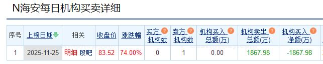 中国经济网北京11月25日讯:海安集团(001233.sz)今日在深交所主板挂牌上市。收盘报83.52元,涨幅74.00%,总市值155.32亿元。龙虎榜数据显示,海安集团销量前五名的企业中,有一家机构独占一席。据统计,今日海安集团卖出的机构席位净值为1867.98万元。
