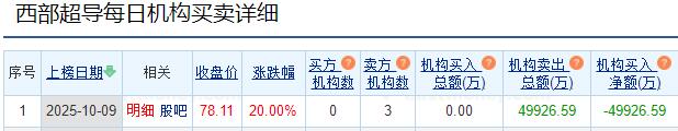 中国经济网北京10月9日电:西部超导(688122)日内触及涨停,收盘78.11元,涨幅20.00%。龙虎榜数据显示,西部超导销量排名前五的企业中,有3家机构独占席位。据统计,目前西部超导出售的机构席位净值为49926.59万元。