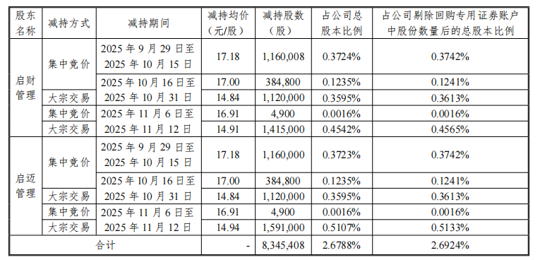 中国经济网北京11月13日讯:贝斯塔克(300822.SZ)昨日晚间披露了关于股东减持计划到期及实施的公告。 2025年7月22日,公司披露了《关于特定股东减持股份的预披露公告》(公告编号:2025-029),林州七彩企业管理合伙企业(有限合伙)(原名:深圳创新财富一号投资合伙企业(有限合伙)合伙企业),现向七彩七麦企业管理合伙企业(有限合伙)(原名:深圳创新)经理披露。财富二号投资合伙企业(有限合伙),以下简称“七麦管理”)合计持有公司股份11,700,000股(占公司股份的3.7%)占公司总股本的556%(扣除专用证券账户中的股份数量后占公司总股本的3.7748%(用于回购),计划自公告披露之日起三个月内(即2025年8月13日至2025年11月3月12日),公司通过集中回购方式持有的股份数量将不超过9,298,731股竞价交易和大宗交易(不超过公司总股本的2.9848%,且不超过回购专用担保账户中股份数量后公司股份的3.0000%)。其中,通过集中竞价方式减持的公司股份总数不超过3,099,577股(即不超过公司总股本的0.9939%,且不超过扣除回购专用担保账户内的股份数量后公司总股本的1.0000%)。 );持有股份总数公司通过大宗交易的股份数量不得超过6,199,154股(即不超过公司总股本的1.9899%,且不超过扣除提款专用证券账户内的股份数量后公司总股本的2.0000%)。 2025年11月12日,七彩管理层、七麦管理层的减持计划期满。公司收到七彩管理层、七麦管理层出具的《关于股东减持计划到期并实施的通知函》。获悉,2025年9月29日至2025年11月12日,七彩管理、七麦管理通过集中竞价、大宗交易方式合计减持公司股份8,345,408股(占公司总股本的2.6788%,剔除专项股票数量后占公司总股本的2.6924%)。安全ies账户用于回购)。经测算,七彩管理层和七麦管理层在这些减持中总共提供了1.31亿元。 Bestak年报显示,肖平、李庆文为公司实际控制人。深圳市创新财富一号投资合伙企业(有限合伙)和深圳创新财富二号投资合伙企业(有限合伙)均由李庆文实际控制。 2020年3月13日,贝斯塔克在深圳证券交易所创业板上市,公开发行新股2667万股,发行价格23.57元/股。保荐机构(主承销商)为国信证券股份有限公司,保荐代表人为郭振国、王攀。首次公开发行募集资金总额6.29亿元,募集资金净额5.5亿元,用于智能控制器及智能制造建设项目、研发D中心建设项目,补充流动资金。贝斯塔克首次发行总成本为7898.59万元,其中国信证券获得保荐及承销费用5657.51万元。
